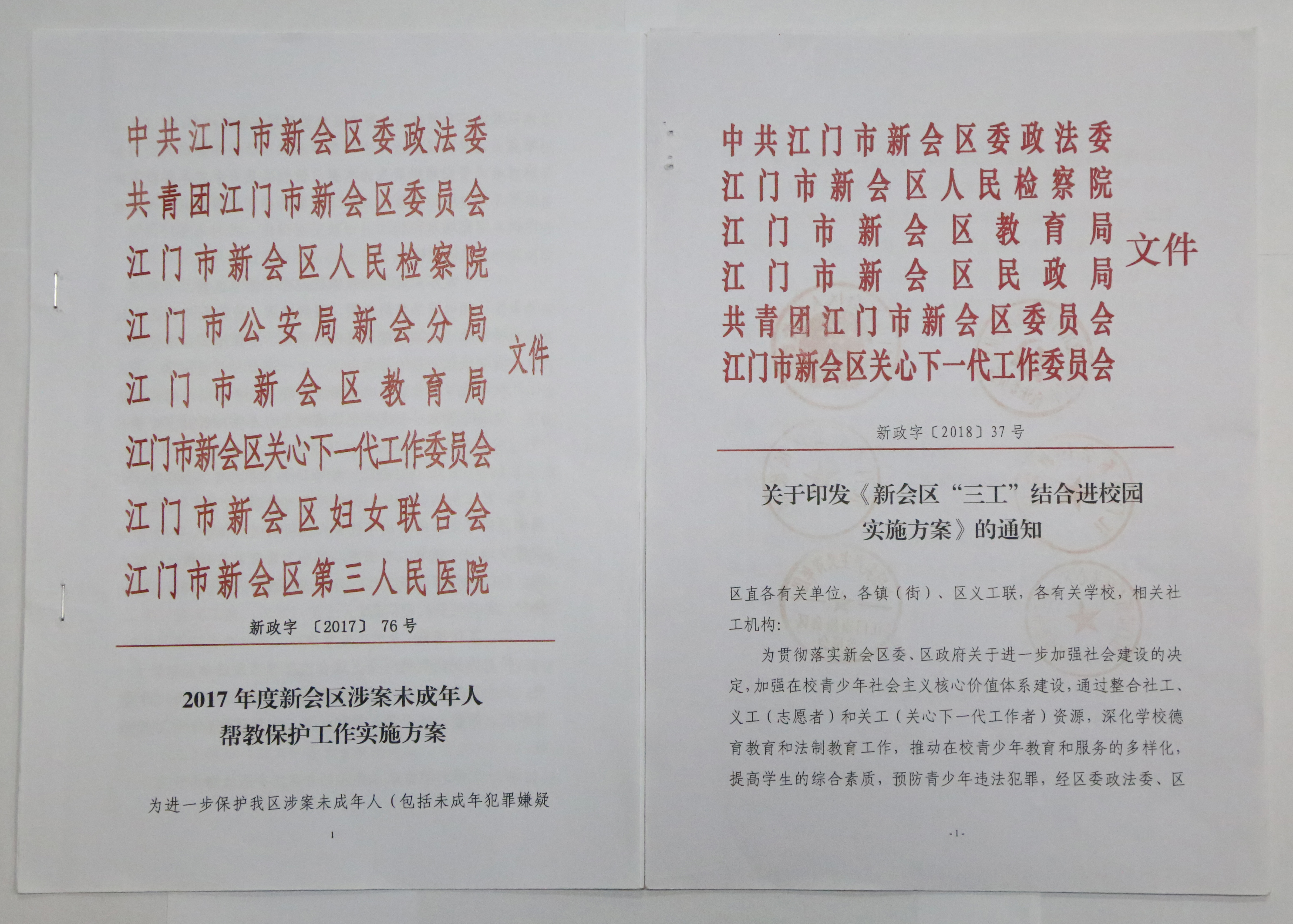 2018年3月,我院与区政法委、共青团、教育局、民政局、关工委联合签订《新会区“三工”结合进校园实施方案》,并制订《工作联席会议制度》、《个案工作机制》。目前,已建成17个“学校型”观护基地,在6个镇街建立“社区型”观护基地。