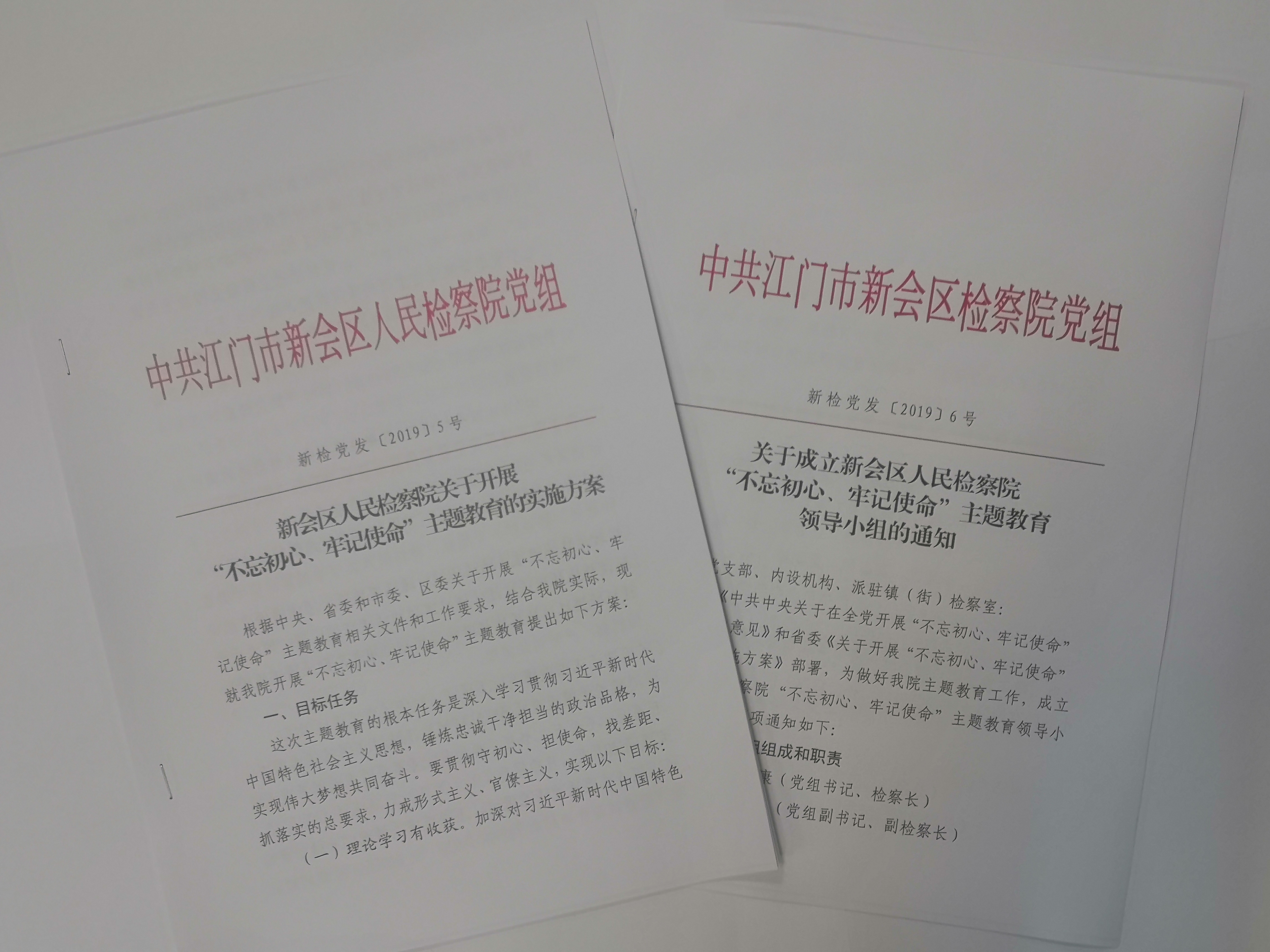 认真抓好活动部署。制定《新会区人民检察院“不忘初心、牢记使命”主题教育实施方案》,成立主题教育领导小组并下设办公室,统筹全局压实责任。
