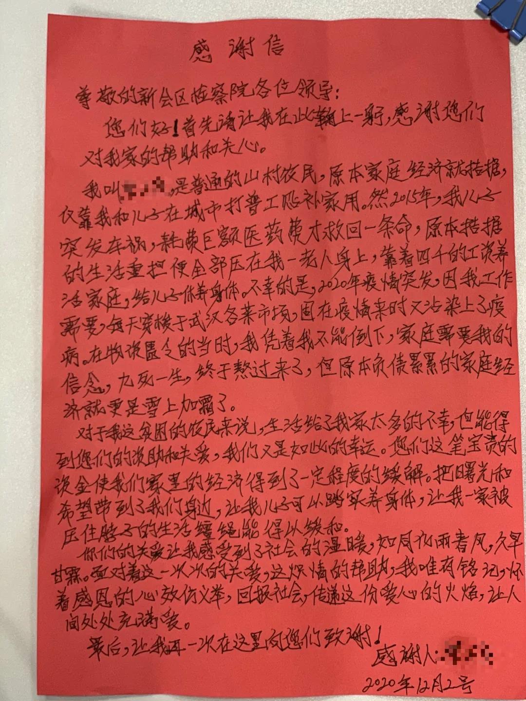 “你们的关爱让我感受到了社会的温暖,如同化雨春风,久旱甘霖……”。12月9日,新会区检察院第六检察部收到一个来自千里之外的湖北武汉寄来的快递件,内有一封感谢信,还有一面绣有“公正执法,为民解忧”的锦旗,表达了廖某良对新会区检察院给予其儿子廖某军司法救助的感激之情。