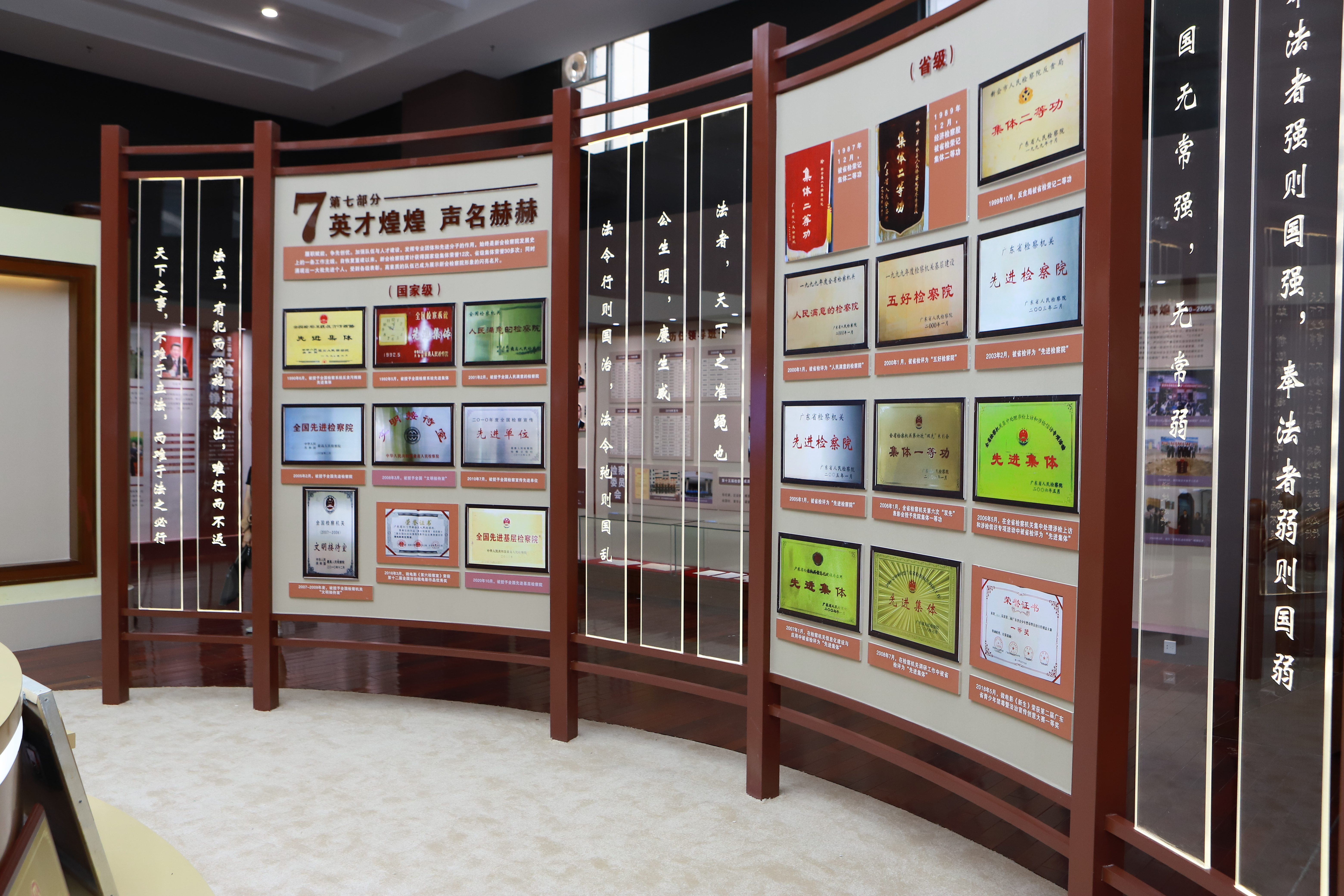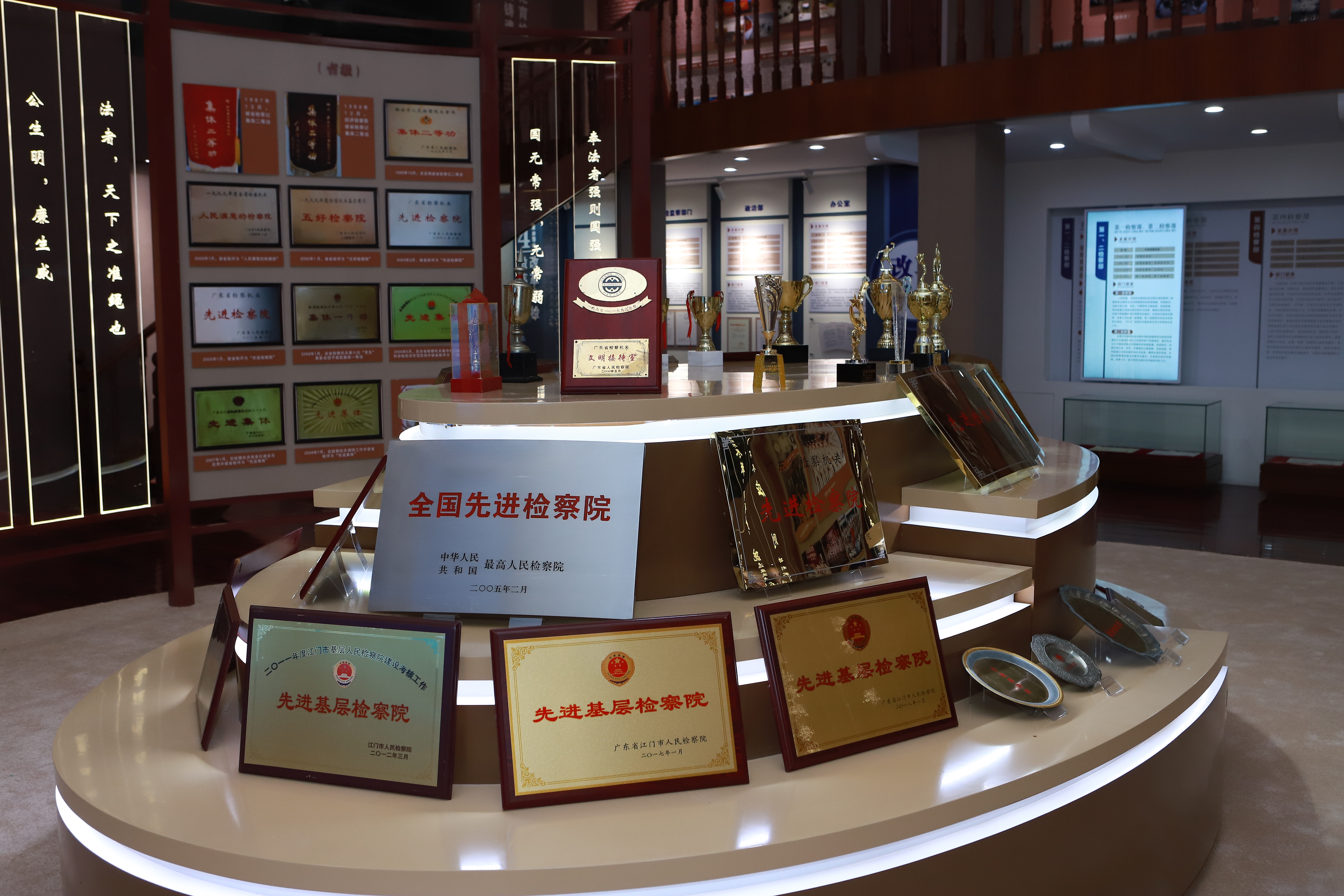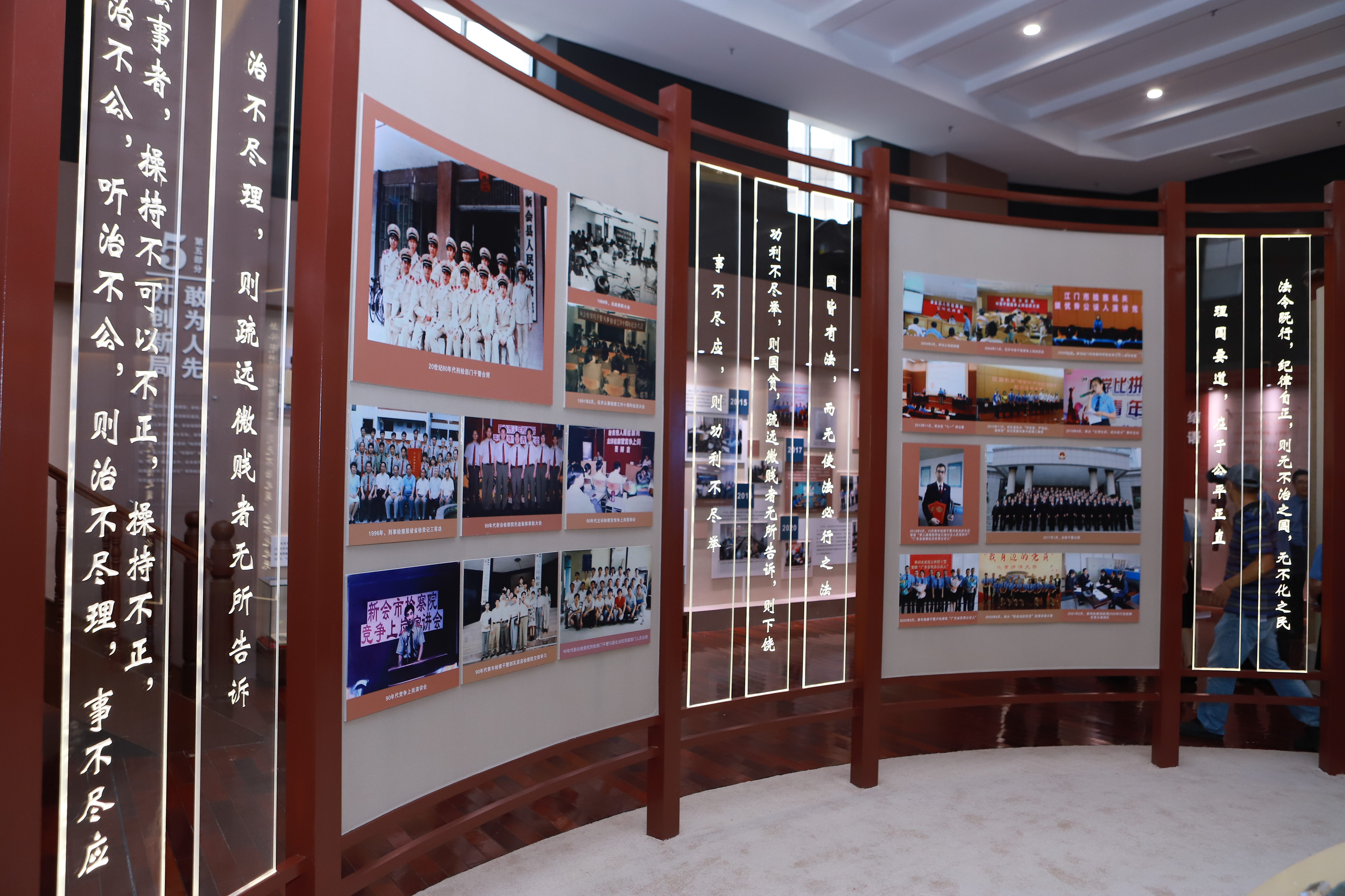 新会区检察院院史馆由“党的领导”“人民检察制度”“新会检察大事记”“内设机构改革”“开创新局”“领导关怀”“文化育检”八个主题展示区组成,充分展现该院自1955年创建以来,在党的领导下走过的66年载光辉历程。