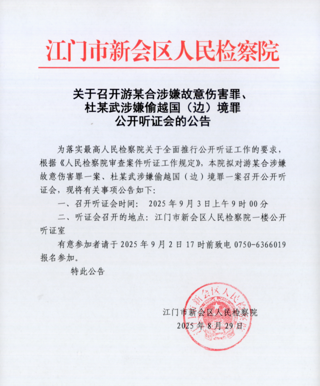 关于召开游某合涉嫌故意伤害罪、杜某武涉嫌偷越国(边)境罪公开听证会的公告