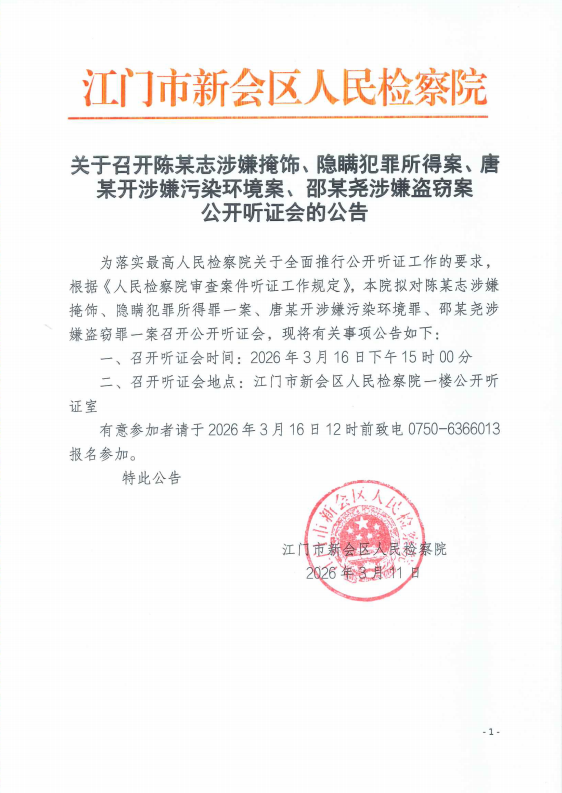 关于召开陈某志涉嫌掩饰、隐瞒犯罪所得案、唐某开涉嫌污染环境案、邵某尧涉嫌盗窃案公开听证会的公告